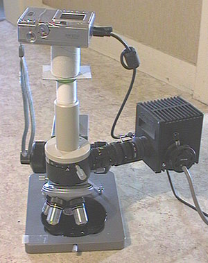 Par économie, je me suis contenté d'un canon ixus comme appareil numérique. C'est un appareil de type compact et il n'est pas doté de filetage pour accessoires sur l'objectif comme les Nikon coolpix 2 fois plus chers. Mais il est malgré tout possible de réaliser des photographie sur microscope. Il suffit pour cela de poser l'appareil avec son objectif très proche de l'oculaire. Au grand angle, l'image est dans un cercle central, mais en zoomant un peu , le cadre est rempli.