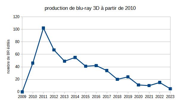 Smith, Lumière...) en anaglyphes. wikipédia donne une liste de 108 titres de films en 3D pour la période 1952 à 2016, certains titres argentiques ont été numérisés. Le blu ray 3D a été commercialisé à partir de 2010 et il existe plusieurs listes des titres de blu-ray 3D parus depuis les premiers sortis: Une liste (sans les documentaires) de 521 titres est affichée sur un site pour 2010 à 2023 (j'en ai tiré les données de la courbe ci-contre). Wikipedia anglais donne une liste plus complète de 2005 à maintenant. Egalement, 422 titres sur le site sens critique. Voici dans un historique une autre liste avec seulement les plus marquantes sorties de films. Enfin, une sélection d'une soixantaine de films à retenir par Jean-Luc Lacuve, en bas de son historique du cinéma 3D (+un élément de sa biblio) avec accès au film audioscopiks de 1935) Un autre site https://www.blu-ray.com/3d/ communique les dernières parutions, qui se réduisent en 2023. (en pratique juste Avatar 2. Et encore, à sa sortie il était déja en rupture de stock en magasin; seules les souscriptions ont été délivrées. Manifestement, les firmes ne veulent pas de 3D familiale et se privent volontairement de cette clientèle en bloquant l'offre de blu ray 3D...) En 2024, Dune 2 n'est pas sorti en 3D semble t il... A noter, une bonne partie de la production est en 3D d'animation, ou en conversion 2D/3D. Il y a peu de 3Ds (filmée avec 2 points de vue) La liste ci dessous correspond à mes achats, le plus souvent en occasion dans les boutiques de 2e main! (un tiers de documentaires) Il y a aussi quelques DVD en anaglyphes, mème si cette technique est déplorable pour les couleurs. |